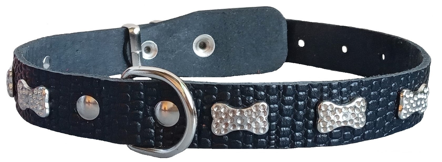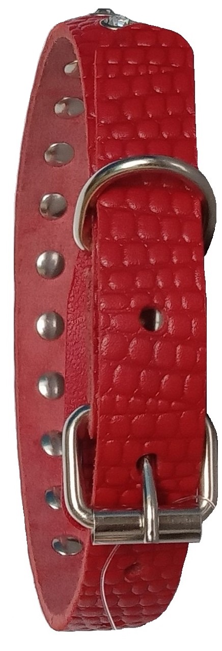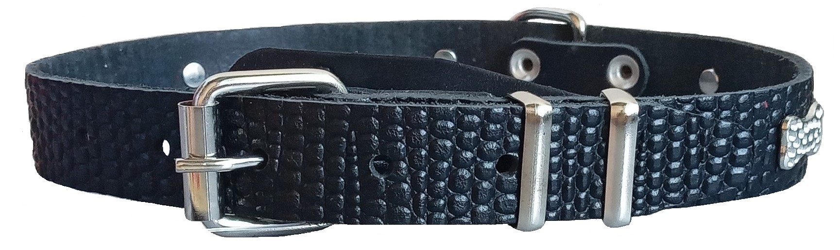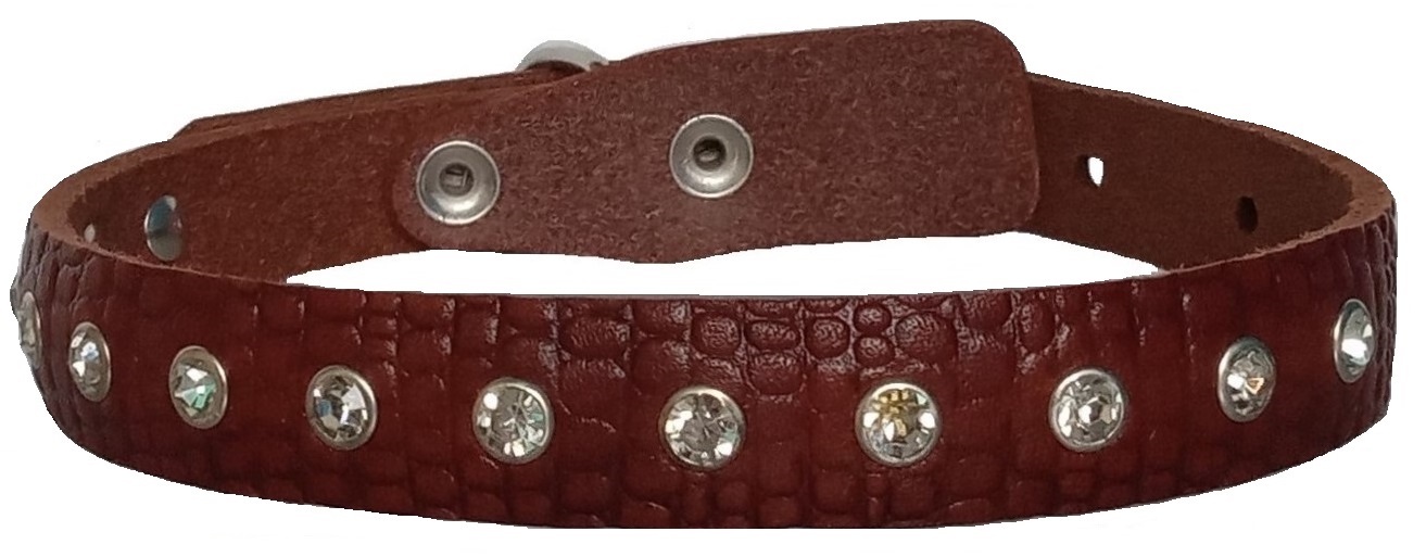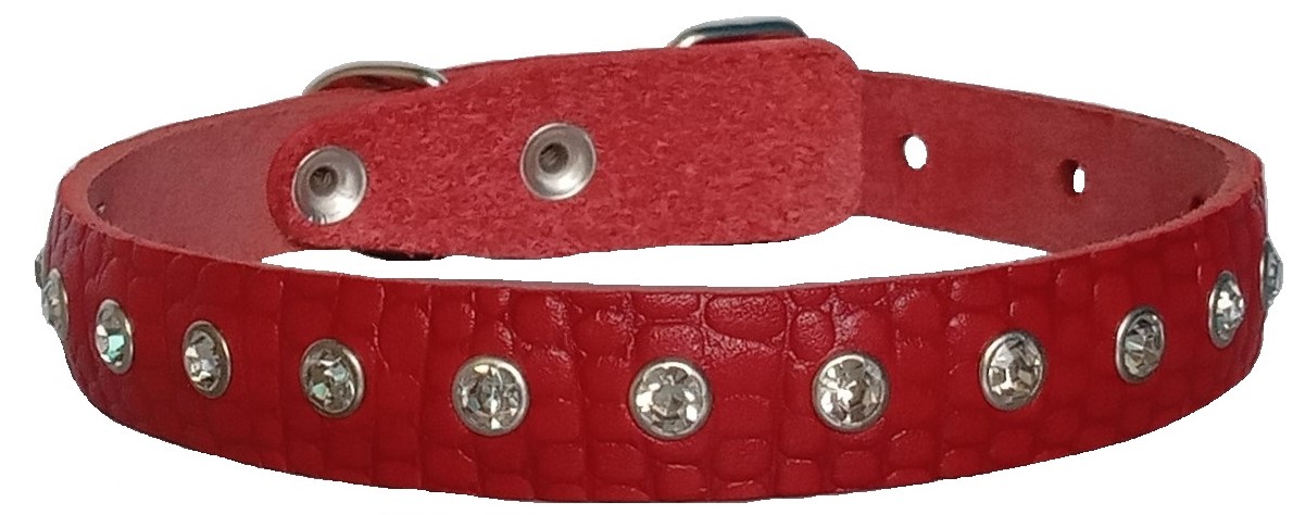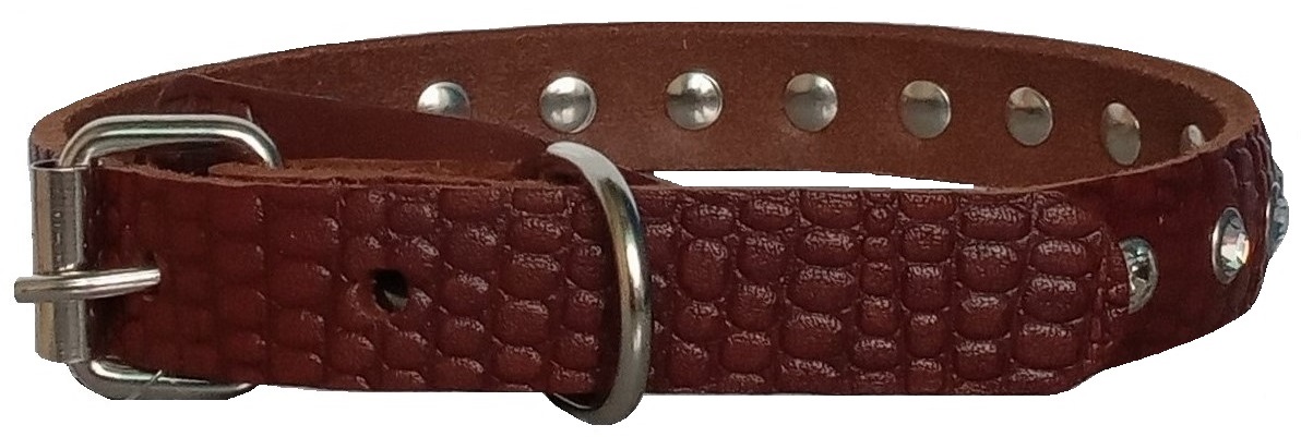 Однослойный ошейник из тисненой натуральной кожи с украшением "стразы", не прошитый. Полукольцо у пряжки.
