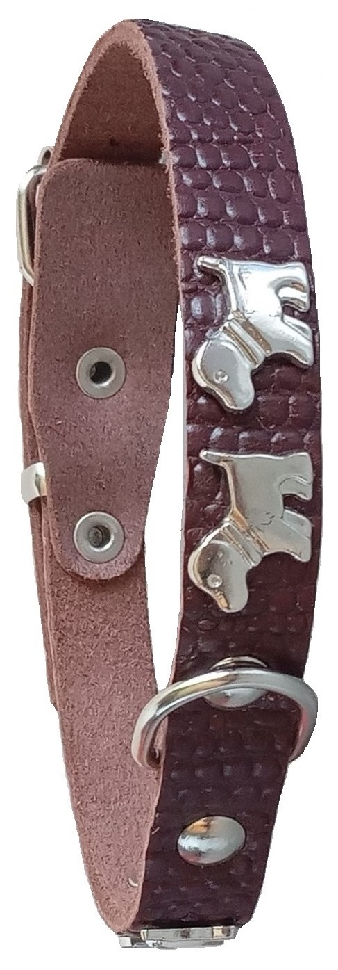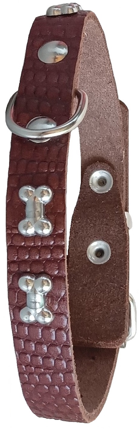 Однослойный ошейник из тисненой натуральной кожи с украшением "люкс" (возможные варианты - косточки, собачки, лапки, бантики, цветы), не прошитый. Полукольцо посередине.