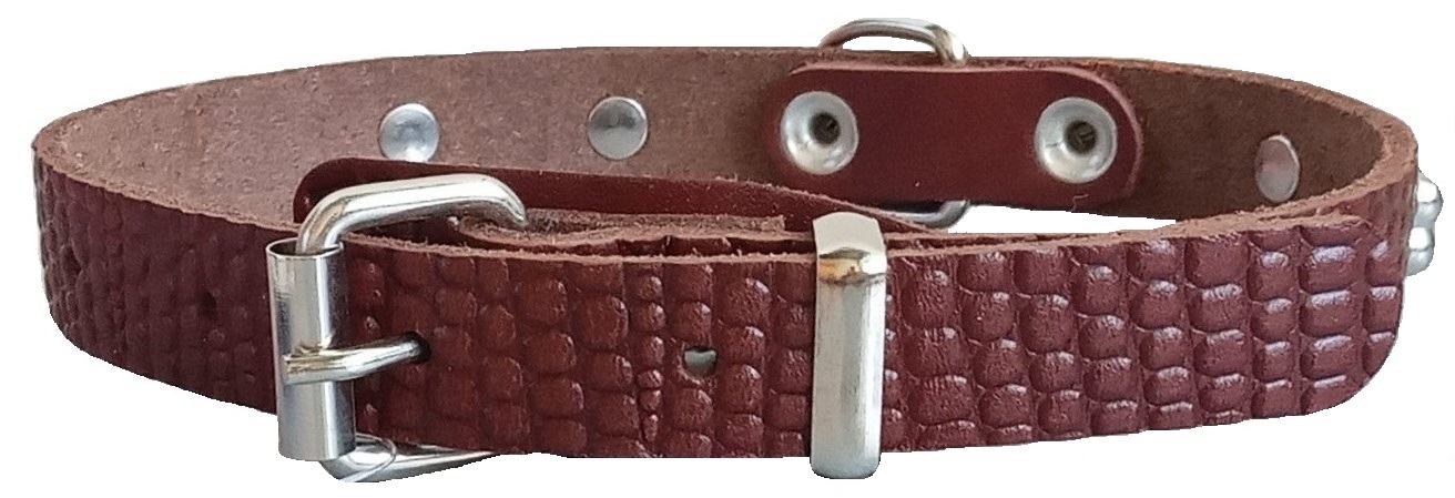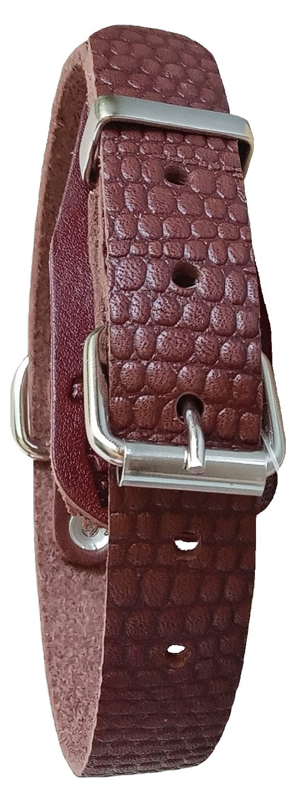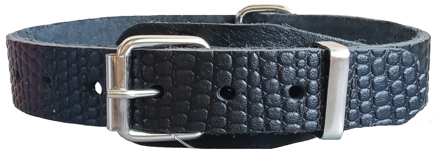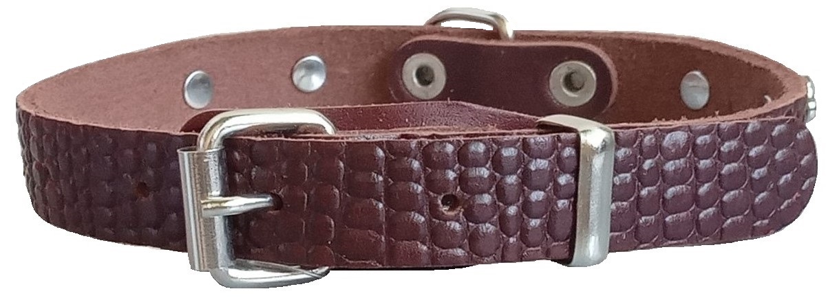 Однослойный ошейник из тисненой натуральной кожи, не прошитый, полукольцо у пряжки.