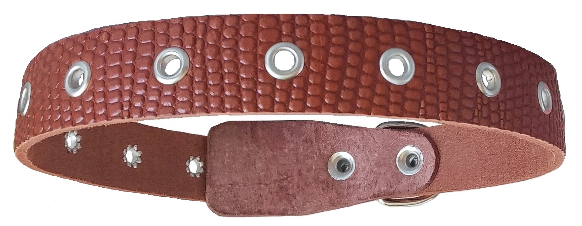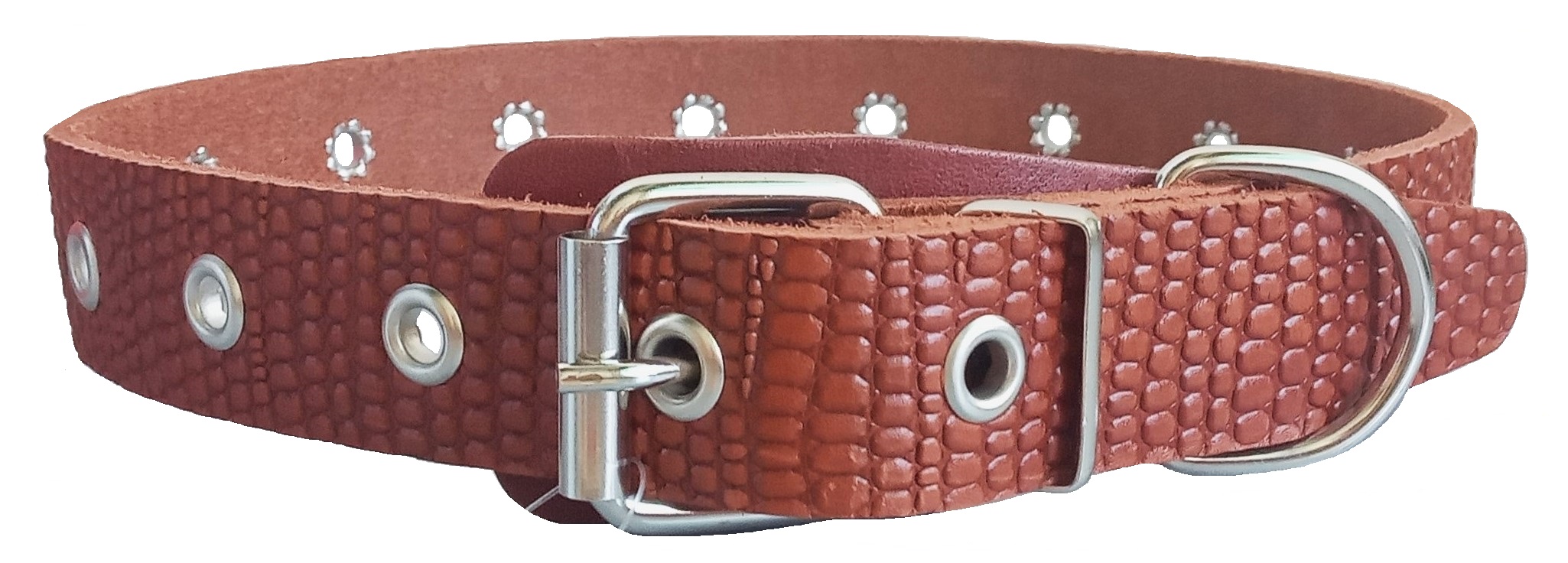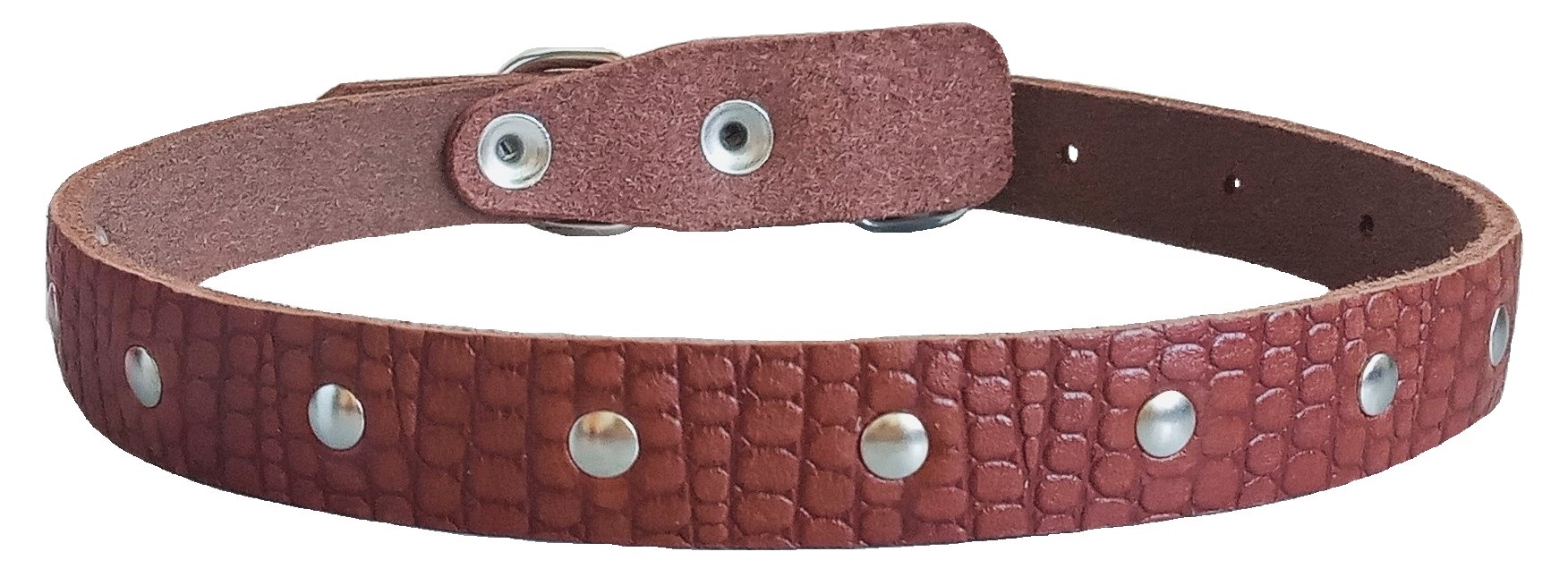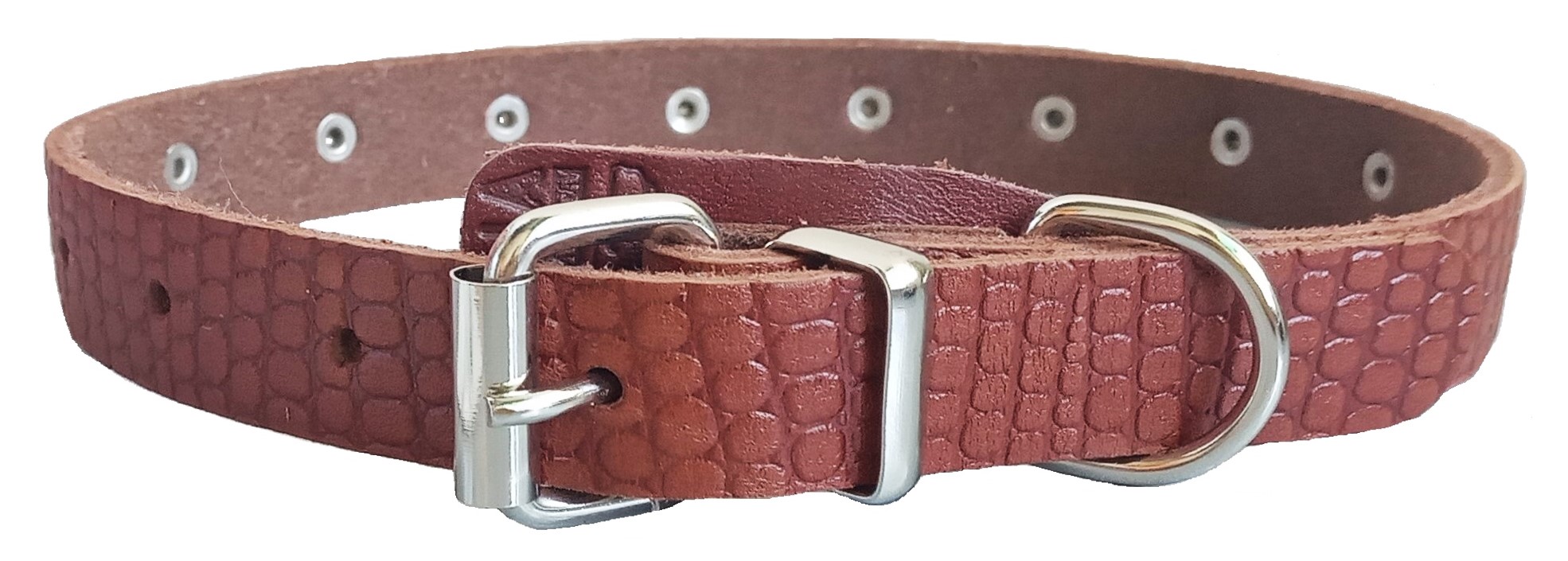 Однослойный ошейник из тисненой натуральной кожи, не прошитый, отверстия укреплены металлической блочкой, полукольцо у пряжки.